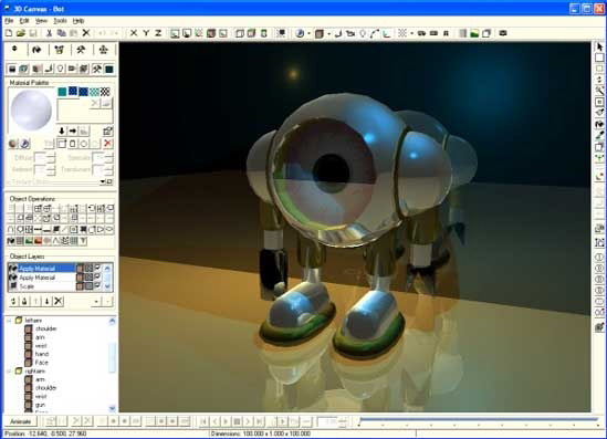 3D Canvas - популярная программа для 3D-моделирования и создания анимации в режиме реального времени. 3D Canvas использует технологию Drag&Drop, поэтому построение трехмерных моделей, в том числе очень сложных, не представялет особых затруднения даже для начинающих пользователей. Принцип создания анимации прост и нагляден: достаточно указать позицию объекта в каждый конкретный момент, и программа автоматически произведет сглаживание траекторий.
