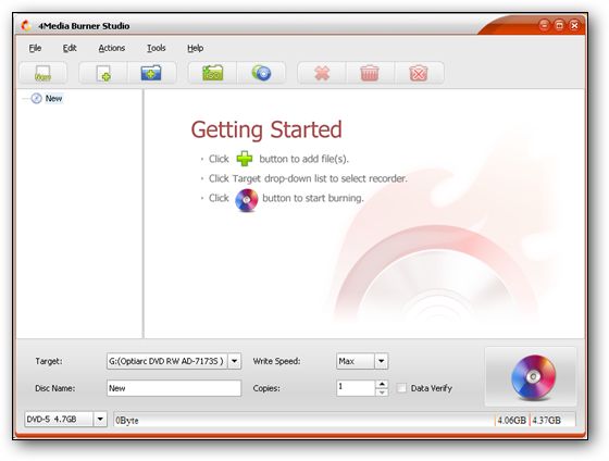 4Media Burner Studio makes it easy to burn multimedia, bootable and image files to data CD/DVD and create ISO image from these files. It also enables you to edit ISO files, backup data CD and unprotected DVD from one disc to another. The DVD burner software supports almost all mainstream disc medium including CD-R, CD-RW, DVD-R, DVD+R, DVD-RW, DVD+RW, DVD+R DL.