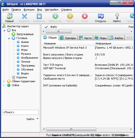 BitSpirit - мощный и удобный в использовании клиент BitTorrent, который не только работает по этому протоколу, но также имеет ряд дополнительных возможностей. Среди них следует отметить: удобный и понятный интерфейс, возможность работы сразу с несколькими закачками, механизм кеширования данных на диск, быстрое восстановление работы, поддержка выбора файлов, удобный файловый менеджер, поддержка опции обмены сообщениями, компрессия по алгоритму GZip, работа по расписанию, интеграция в IE, поддержка HTTP/SOCKS4/5 Proxy, малая требовательность к ресурсам ПК.