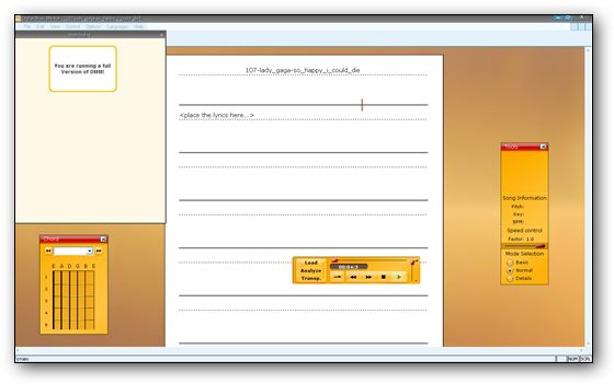 Данная программа позволяет проанализировать музыкальный трек, записанный на CD или в MP3, после чего автоматически составляется гармоническая картина произведения и отображаются аккорды. То есть не имея таблатуры своей любимой песни Вы можете натравить на эту песню DMM и получить автоматически подобранные аккорды. Полученную партитуру можно транспонировать, прослушать, проиграть с контролем тона (программа будет автоматически проверять тональность и правильность Ваших аккордов), а также получить разные варианты аккордов из большой базы обращений аккордов. Заявленная вероятность ошибки определения гармонии 10-15% для стилей поп и рок.