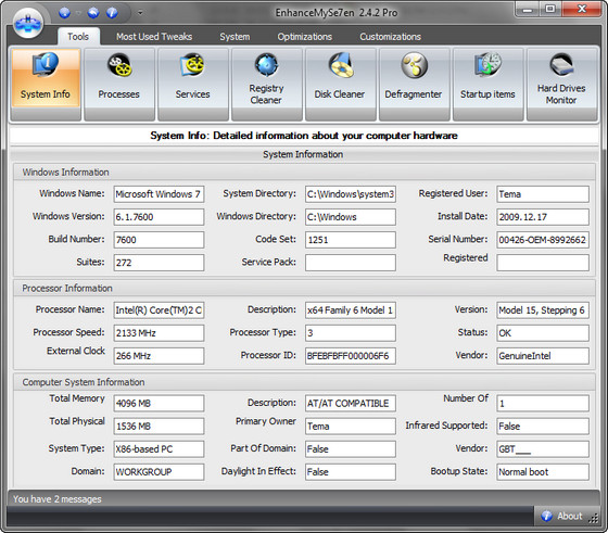 EnhanceMySe7en включает в себя менджер автозагрузки, менеджер процессов, модуль очистки жесткого диска, дефрагментатор жесткого диска, "чистильщик" системного реестра, монитор жесткого диска (температура, время работы, серийный номер и т.п.), модуль настройки интернет-соединения, а также средства для быстрого доступа к "тонким" настройкам операционной системы.