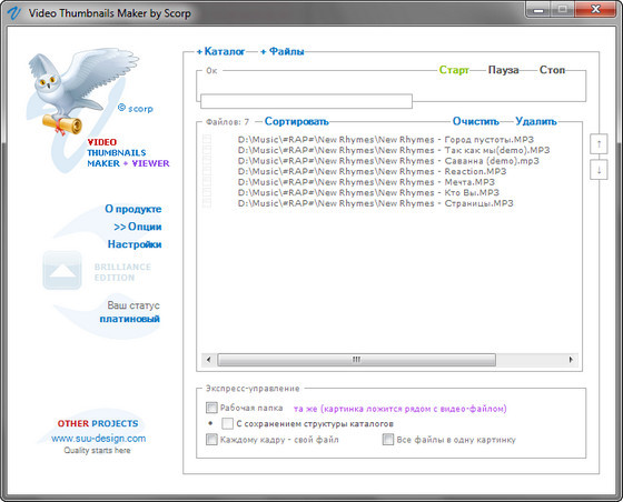 Video Thumbnails Maker - это программа, которая позволяет снимать "превью" с видеофайлов. Утилита имеет широкий диапазон настроек. Поддерживается пакетное снятие превьюшек, раскадровка, водяные знаки, обрезка углов кадров, рамки, тени, альфа-каналы, штамповка времени в кадрах, добавление информации о видео, настраиваемые прозрачность, цвета и шрифты. Поддерживаемые форматы видео? Любые, для которых есть подходящие кодеки (читайте, любые, которые воспроизводятся в BSPlayer-e, Windows Media Player-e, ...). Для работы программы необходим Microsoft .NET 2.0.