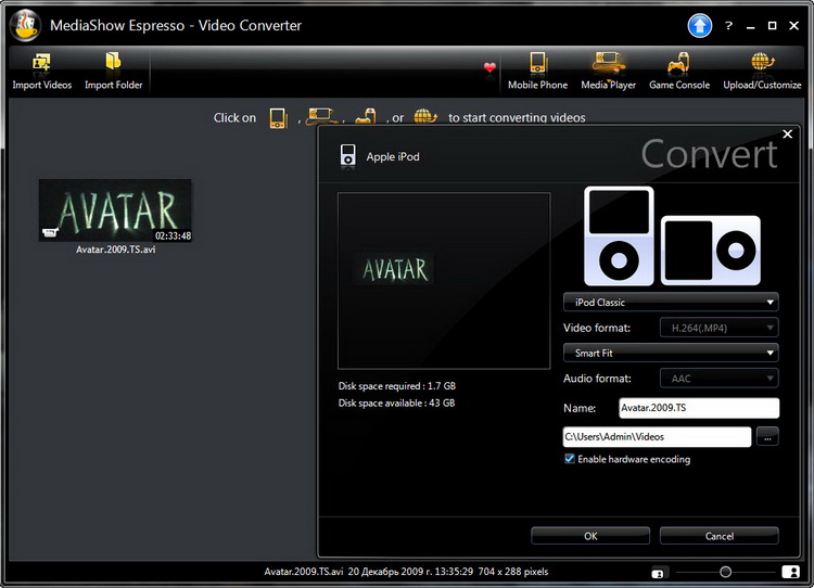 MediaShow Espresso - программа для преобразования видеофайлов в форматы для портативных устройств и онлайн видео. C помощью данной программы вы сможете преобразовать все ваши любимые фильмы и видеоролики в форматы для iPhone, PSP, Xbox, YouTube и других устройств и служб в Интернете. Для этого достаточно выбрать предпочтительный мультимедийный проигрыватель или способ преобразования и MediaShow Espresso сделает остальную работу сам без вашего вмешательства.