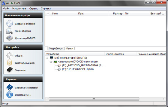 Alcohol 52% - широко известная программа для эмуляции CD/DVD приводов, которая позволяет создавать точные копии дисков и загружать их в виртуальные накопители. Бесплатная версия приложения позволяет создать 6 виртуальных накопителей, каждый из которых может работать с образами дисков на скорости 200x. Поддерживается большое количество разнообразных форматов образов дисков: MDS, CCD, BIN, CUE, ISO, NRG, CDI, BWT и другие, возможна регистрация пользовательских расширений файлов-образов. Программа будет полезна всем, кому часто приходится вставлять и вынимать различные CD/DVD диски. С её помощью можно разместить все часто используемые носители в виде образов на жёстком диске вашего компьютера.