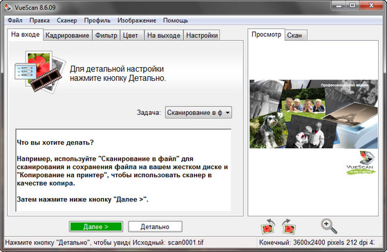 VueScan Pro - программа для работы со сканерами HP, Minolta, Nikon, Polaroid, Epson, Canon и другими. Может работать с внутренней глубиной цвета. VueScan поддерживает автоматическую и ручную настройку большинства параметров и пакетный режим сканирования. Поддерживается более 500 моделей сканеров с определенным перевесом в сторону слайд-сканеров — Nikon, Minolta, Polaroid, Microtek, Epson. Предусмотрено автоматическое удаление дефектов изображения за счет канала инфракрасного сканирования и многопроходное сканирование с последующим усреднением результата — для подавления собственных шумов сканера. Имеются фильтры подавления зерна, нерезкого маскирования и удаления паразитного оттенка оригинала. Есть средства ручной корректировки динамического диапазона и градационной характеристики (независимо по каналам R, G, B).