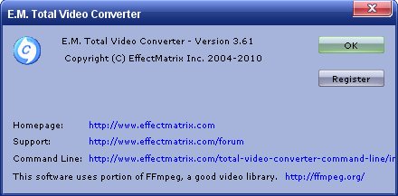 E.M. Total Video Converter HD - это как раз именно тот конвертер, который умеет делать с файлами почти всё. E.M. Total Video Converter это программа не только для конвертирования почти всех видов видео и музыкальных файлов в популярные форматы, включая мобильные, но и CD-риппинг, конструктор фото слайд-шоу с 300-ми различными фантазийными переходными эффектами, сборка и прожиг дисков отвечающих DVD/SVCD/VCD стандартам, извлечение звука из видео файлов с прямой конвертацией в mp3, ac3, ogg, wav, aac, объединение звука и видео в единый файл с синхронизацией, снифер-загрузчик флэш-видео Flv, и многое другое, снабженное собственным высокоскоростным встроенным "движком" и наделенное качественным проигрывателем.