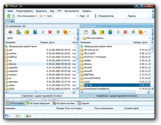 FTPRush - это простой и удобный FTP-клиент, который позволяет не только переслать файлы между компьютером и сервером (туда и обратно), но также поддерживает передачу файлов непосредственно между серверами (FXP). Программа позволяет работать сразу с несколькими FTP одновременно, обладает гибким, настраиваемым интерфейсом, имеет встроенный Менеджер Задач, поддерживает работу с прокси. FTPRush может работать с SSL-соединениями, автоматически проверять SFV-файлы при скачивании и загрузке и многое другое.