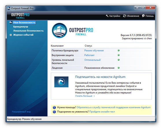 - Outpost Firewall Pro использует специализированные методики для своей собственной защиты, которую невозможно отключить даже с помощью специально созданных вредоносных программ.