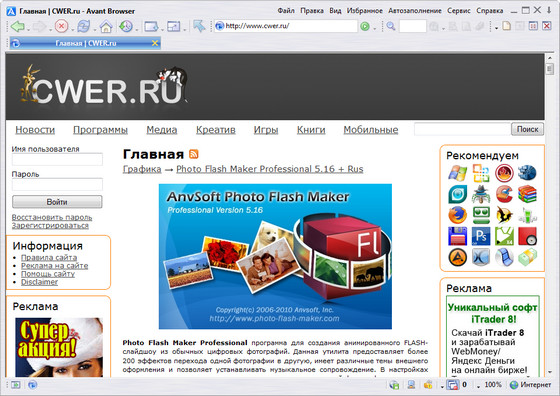 Avant Browser - браузер на основе Internet Explorer для расширения опций браузера и повышения комфортности интернет-серфинга, с отображением всех открытых веб-страниц в одном многовкладочном окне, автозакрытием рекламных окон, быстрым отключением / включением загрузки графики, удобным удалением временных интернет-файлов, интеграцией с поисковиком Google, скинами и сменными кнопками, подключением средней кнопки мыши, управлением мышью и т.д. Интерфейс меняется скинами (с домашней страницы можно скачать программку для создания своих собственных скинов).