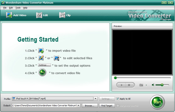 Wondershare Video Converter Platinum - конвертер видео файлов различных форматов. Поддержка MP4, MOV, 3GP, AVI, WMV, RM, MPEG-1, MPEG-2, FLV, ASF и других форматов, извлечение аудио из видео в M4A, WMA, WAV, MP3, AAC, AC3 и другие аудио форматы, поддержка iPod, iPhone, Apple TV, Zune, PSP, Pocket PC, CreativeZen, Archos и других устройств, предварительный просмотр видео, пакетный режим работы, настройка параметров сохранения с выбором из списка стандартных, высокая скорость, приятный и простой интерфейс.