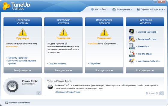 TuneUp Utilities 2010 - новая версия большого набора всевозможных инструментов для настройки и оптимизации системы. При помощи этой программы вы сможете очищать диски от мусора, удалять неверные записи из системного реестра и дефрагментировать его, оптимизировать оперативную память, управлять автозагрузкой, навсегда удалять файлы с диска при помощи специальной утилиты ”TuneUp Shredder” (дальнейшее восстановление становится невозможно даже при помощи специальных программ), восстанавливать удаленные файлы, изменять внешний вид Windows, и многое другое. Все утилиты этого пакета объединены в единую графическую оболочку. Для запуска той или иной утилиты нужно выбрать ее название в списке и кликнуть по ней мышкой. После этого открывается диалоговое окно, в котором и производятся все соответствующие действия. Пакет объединяет в себе важные функции для оптимизации системы, конфигурации, очистки и обслуживания в современном графическом пользовательском интерфейсе.
