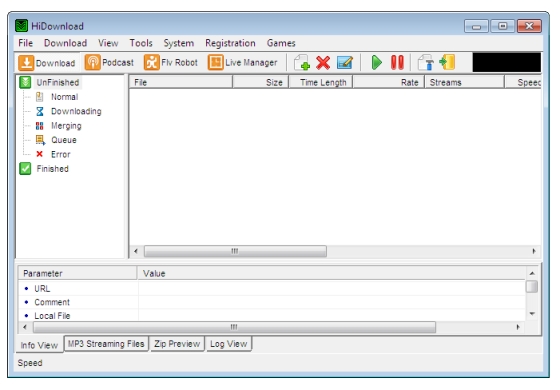 HiDownload - менеджер загрузок. Поддерживает работу по протоколам HTTP, FTP, RTSP (Windows Media), PNM, MMST и MMSU (это значит, что потоковое аудио - RA, RM и Apple Quicktime Streaming - можно "скачать" без проблем). Может работать через прокси, позволяет просматривать архивы и скачивать из них только необходимые файлы, позволяет сохранять Flash, имеется встроенный поиск MP3-файлов. Кстати говоря, есть у этой программы и внутренний поиск.