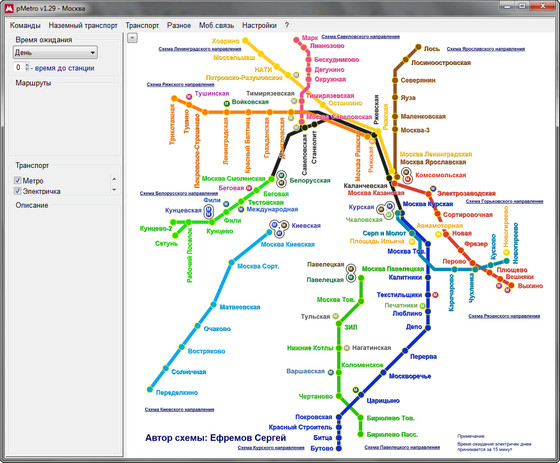 pMetro - справочник метро Москвы и других городов. Отображает схему метро города (а для некоторых городов и схему электропоездов), позволяет найти кратчайшие пути между станциями, а также описывает, что находится рядом со станциями.