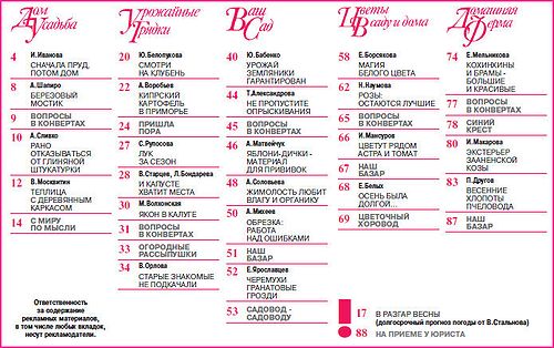 В номере рассказывается о сооружении на участке пруда и деревянной теплицы, других строительных делах. Вопросы обрезки и опрыскивания, картофель, лук, капуста, земляника, розы и астры, разнообразная домашняя живность - эти и другие темы также нашли свое отражение в очередном номере журнала.