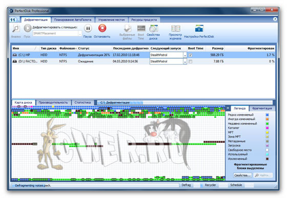 Данные в этой таблице отображаются в виде разноцветных квадратиков, расшифровку цвета которых можно посмотреть в главном окне PerfectDisk. Стоит отметить довольно быструю работу утилиты. Это связано с тем, что используется однопроходный метод дефрагментации с учётом S.M.A.R.T. данных винчестера. Может дефрагментировать не только локальные диски, но и с сетевые, причем в этом случае для облегчения настройки заданий используются профили сетевого планирования дефрагментации и полностью настраиваемое протоколирование работы. Поддерживаются работа с RAID-томами.