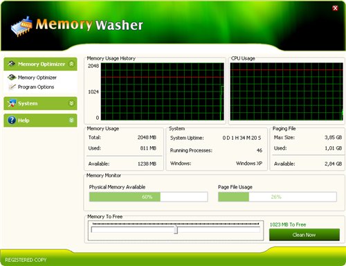 Memory Washer - программа, которая позволяет увеличить быстродействие Вашего компьютера за счет освобождения оперативной памяти. В Memory Washer есть возможность установки минимального количество свободной оперативной памяти, при превышении которого запустится модуль и попытается удалить из оперативной памяти лишние процессы. Кроме этого, есть возможности настройки меню автозагрузки Windows и множество других полезных настроек.