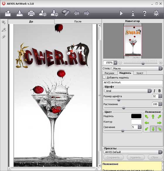 В программе есть возможность выбрать рельефную или ровную поверхность (холст, бумагу), на которую будет наноситься краска, что усилит эффект достоверности, а также добавить художественно оформленный текст на готовое полотно (подпись автора, поздравительную или другую надпись).