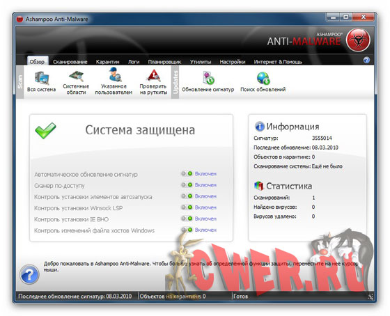 Ashampoo Anti-Malware - утилита, способная находить и удалять разнообразное вредоносное ПО. Программа использует эвристический метод сканирования, позволяющий в реальном времени контролировать безопасность всей системы. Также имеется возможность полного сканирования всех дисков.