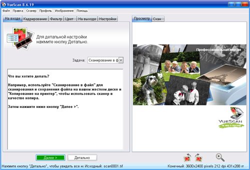 VueScan Pro - программа для работы со сканерами HP, Minolta, Nikon, Polaroid, Epson, Canon и другими. Может работать с внутренней глубиной цвета. VueScan поддерживает автоматическую и ручную настройку большинства параметров и пакетный режим сканирования. Поддерживается более 500 моделей сканеров с определенным перевесом в сторону слайд-сканеров — Nikon, Minolta, Polaroid, Microtek, Epson. Предусмотрено автоматическое удаление дефектов изображения за счет канала инфракрасного сканирования и многопроходное сканирование с последующим усреднением результата — для подавления собственных шумов сканера. Имеются фильтры подавления зерна, нерезкого маскирования и удаления паразитного оттенка оригинала. Есть средства ручной корректировки динамического диапазона и градационной характеристики (независимо по каналам R, G, B).