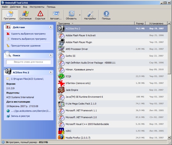 - просмотр детальной информации о любой программе, установленной на вашем компьютере