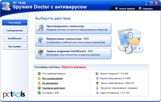 Технология Smart Update обеспечивает частые автоматические обновления как самой программы Spyware Doctor with AntiVirus, так и ее базы данных, что гарантирует защиту от новых вирусов и других вредоносных объектов. Сигнатуры угроз обновляются каждый день кроме выходных, а в случаях появления особо опасных вредоносных программ, чтобы защитить ваш компьютер, обновление осуществляется в считанные часы.