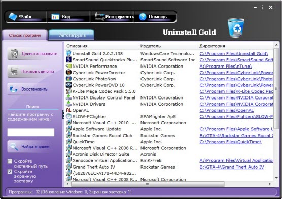 Uninstall Gold - удобная и небольшая по размеру утилита для качественной деинсталляции установленных ранее приложений. Uninstall Gold обладает большим количеством функций: показывает скрытые установленные программы, сортирует список программного обеспечения по заданному фильтру, удаляет некорректно инсталлированные и деинсталлированные программы и многое др...