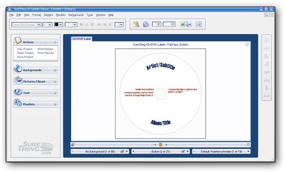 Чтобы оформить диск, необходимо только указать формфактор и просто запустить соответствующий ему мастер. Вы также с легкостью можете создать новые варианты оформления, используя имеющиеся у вас рисунки. Для того, чтобы вам не пришлось вручную заполнять поля с именами артистов и названиями треков, CD Labeler позволяет импортировать информацию из тегов музыкальных файлов. Имеет множество встроенных шаблоной и материалов оформления.