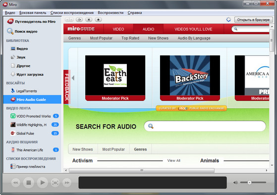 Miro - медиаплеер, основное предназначение которого - облегчение просмотра видео в Интернете. Плеер позволяет подключаться к видео-каналам, загружать видео-файлы на компьютер, просматривать ролики в полноэкранном режиме и т.д. Miro прост в работе и абсолютно бесплатен. Смотрите практически любое видео - Quicktime, WMV, MPEG, AVI, XVID и другие форматы. Просматривайте свою коллекцию, делайте плейлисты, сохраняйте порядок. Подписывайтесь на любые потоки RSS, содержащие видео, подкасты или видеоблоги. Исследуйте сотни свободных каналов при помощи встроенной программы передач.
