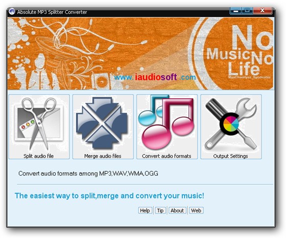 Absolute MP3 Splitter Converter - небольшая и мощная программа для разделения на части, слияния и конвертации аудио файлов.С помощью данной утилиты вы сможете разделять большие аудио файлы на несколько маленьких, к примеру, для создания реалтона на мобильный телефон, сливать несколько маленьких файлов в один большой аудио файл, а также конвертировать аудио файлы между различными форматами без потери качества звука. Программой поддерживается четыре основных формата для разделения, слития и конвертации между ними, такие как MP3, WAV, WMA и OGG. Легкий в использовании пошаговый интерфейс Мастера пошагово поможет вам проеделать весь процесс разделения, слияния или конвертации быстро и легко, как никогда. В добавок, программа позволяет редактировать ID3 теговую информацию текущего файла.