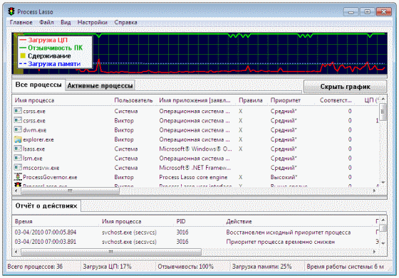 Process Lasso Pro - небольшая утилита, позволяющая вручную или автоматически манипулировать процессами, запущенными на вашем компьютере для достижения максимального быстродействия и стабильности. Эта утилита не является заменой стандартному менеджеру процессов, она, скорее, добавляет новые функции, которые позволяют оптимизировать работу ЦПУ при максимальной нагрузке. Программа дает возможность определить приоритет процессов, причем, по желанию пользователя приоритет будет задан и для всех последующих запусков. Также при помощи этой утилиты можно выполнить завершение работы нежелательных процессов. Кроме этого, программа позволяет вести статистику запущенных процессов. Программа имеет отдельную версию для 64-битных систем, а интерфейс программы обладает поддержкой русского языка.