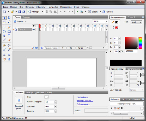 Sothink SWF Quicker - мощное приложение для редактирования и создания Flash роликов в формате SWF для вебсайтов. С помощью этой программы вы сможете создавать флэш-игры, ролики, анимационные динамические баннеры для ваших сайтов, текстовые эффекты, веб-альбомы, слайдшоу презентации и многое другое. Для новичков программа предлагает быстрое создание флэш-анимации с помощью Мастера создания нового проекта с выбором типа и шаблона для вашего проекта. Редактор программы предоставляет возможности для редактирования всех элементов во флэш-видео, например, добавление или изменение текста, замена форм или звуков, назначение ссылок и т.д. К каждому объекту флэш-сцены вы сможете применить встроенные в программу эффекты перехода или появления объекта. Возможно, для вас эта программа сможет стать заменой приложению Adobe Flash, т.к. обладает простым и легким в понимании и использовании интерфейсом.