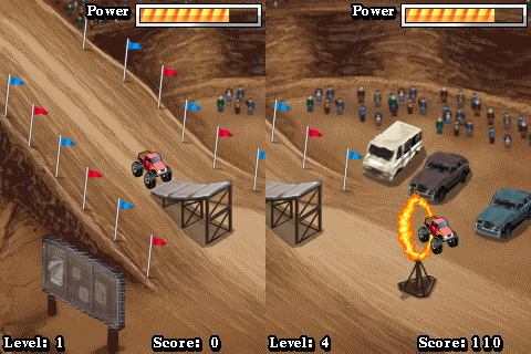 Садись за руль нереально огромного монстра на колесах и совершай безумные трюки! Эти автогиганты могут проехать не только по любому бездорожью, но и утолить вашу жажду адреналина, кувыркаясь в воздухе и пролетая сквозь огненные кольца! Педаль в пол, руки на руль - поехали! Размер экрана: 128x128, 128х160, 176х220, 240х320.
