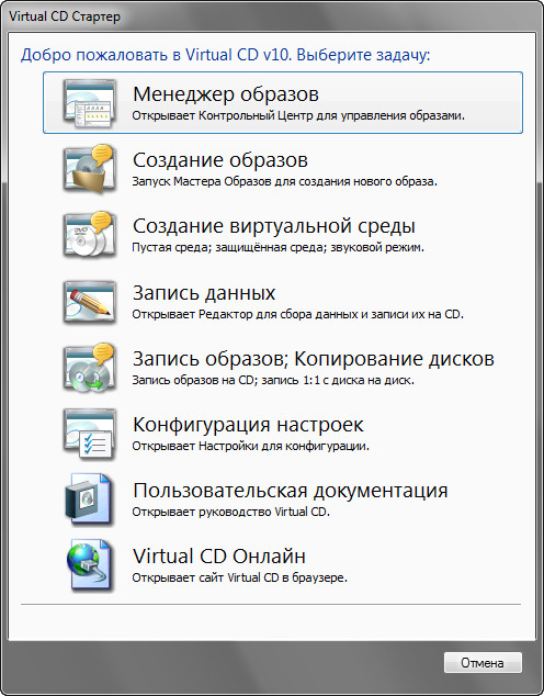 Virtual CD - программа для создания виртуальных компакт-дисков. Допускает создание до 25 виртуальных CD/DVD-приводов и ограниченное только размером свободного места на жестком диске количество образов CD/DVD, которые при необходимости смогут работать одновременно с разными приложениями. Еще одно применение нескольких виртуальных CD-драйвов - установка в них наиболее часто используемых образов компакт-дисков на постоянной основе (в этом случае не нужно будет сначала "вставлять" их в виртуальный CD-драйв, а уж только потом пользоваться). Программа умеет работать с Data / Audio / mixedmode CD, DVD-ROM, non-CSS DVD-Video, Photo-CD и CD-Text.