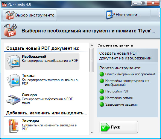 В комплекте с профессиональной версией PDF-XChange поставляется также PDF-Tools - инструмент для создания новых PDF-файлов из изображений и манипулирования имеющимися файлами. С помощью этого инструмента можно с легкостью объединять PDF-файлы, удалять из них страницы, извлекать отдельные фрагменты, изображения и текст, создавать и редактировать закладки, а также отправлять файлы по электронной почте и размещать их на серверах по протоколам HTTP и FTP.