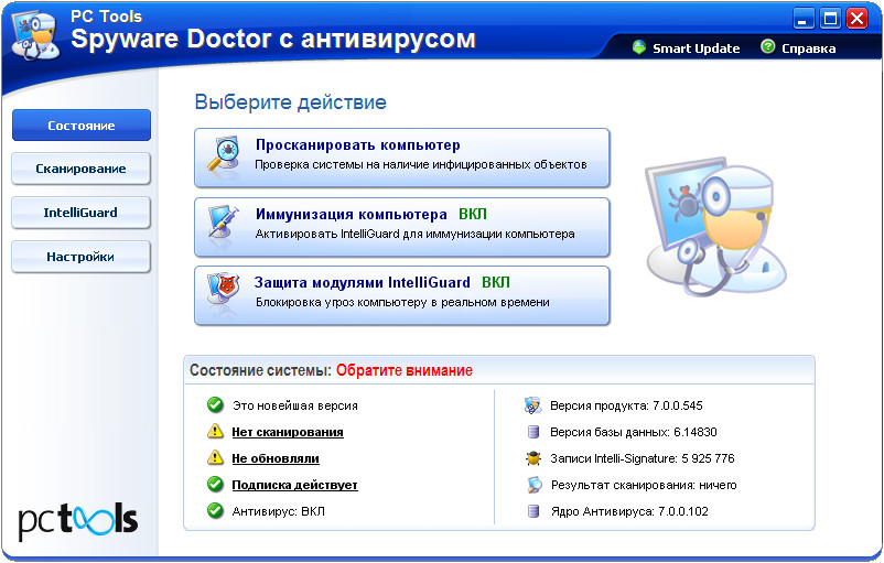 Пока программы-шпионы совершенствуются, чтобы избежать обнаружения программами защиты от них, Spyware Doctor реагирует на это новыми технологиями, опережая их на один шаг вперед.Усовершенствованная технология IntelliGuard программы Spyware Doctor предупреждает пользователей только о факте обнаружения программ-шпионов и вирусы. И это важно, ведь пользователь не должен отвлекаться на сложные вопросы каждый раз при установке программ, добавлении сайта в список избранных или изменения настроек компьютера. Такие сообщения могут сбивать с толку и привести к нежелательным последствиям, например, к выходу из строя программ, потере закладок или запуску в систему программы-шпиона и вирусы.