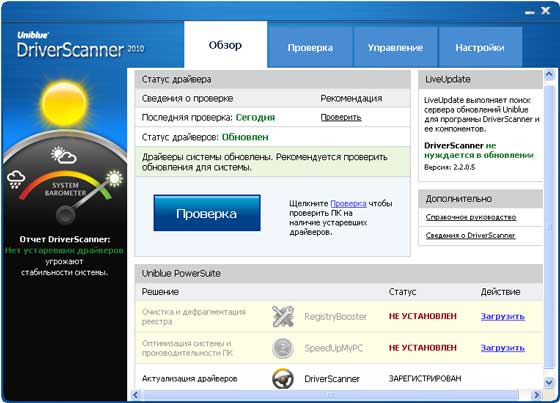 Uniblue DriverScanner 2010 программа, предназначенная для обновления драйверов разнообразных устройств. Программа автоматически определяет устаревшие драйверы, находит в интернете более новые, после чего предлагает их загрузить и установить.