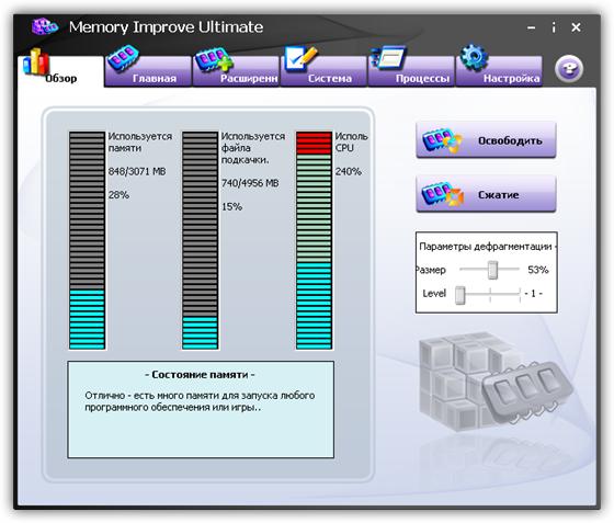 Memory Improve Ultimate - программа предназначена для увеличения быстродействия вашей системы за счет освобождения (дефрагментации) оперативной памяти.В программе присутствует возможность установки минимального количество свободной оперативной памяти, при превышении которого запустится модуль и попытается удалить из оперативной памяти лишние процессы, Кроме этого, имеется возможность просмотра запущенных процессов, наблюдение за нагрузкой на ЦП и множество других полезных настроек.
