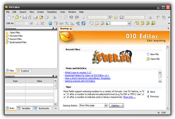 SweetScape 010 Editor – это профессиональный HEX-редактор, разработанный для редактирования любого бинарного файла, устройства или процесса на вашем компьютере. Используя уникальную технологию Бинарных Шаблонов, 010 Editor позволяет проанализировать бинарный файл. К характеристикам редактора относится простота в использовании со стандартным набором опций, таких как: вырезать, копировать и вставить, поддержка больших файлов и неограниченные уровни отмены и отмены последней операции для всех операций редактирования. В набор сервисных программ редактирования и анализа включены: поиск , перемещение, сравнение бинарных файлов, гистограммы, проверка суммы, ASCII/EBCDIC/UNICODE преобразования, поиск в файле, импорт , экспорт, подчеркивание, пометки и печать. Имеется онлайн хранилище шаблонов и сценариев, которые доступны для скачивания.