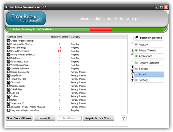 Error Repair Professional найдет неполадки в реестре, библиотеках данных системы и приложений, а также серьезные ошибки, допущенные пользователем, ставящие безопасность системы под угрозу. Ошибки в операционной системе могут привести ко многим неприятностям. Избежать их можно только одним способом — вовремя обнаружить и исправить. И то и другое поможет сделать данная программа. Сохранит ваш ПК, работающим без проблем. При помощи этой программы вы можете просканировать систему, идентифицировать, очистить и восстановить ошибки одним кликом мыши. Пошагово утилита просмотрит ваш реестр на предмет любых недействительных записей и представит вам список найденных ошибок реестра.