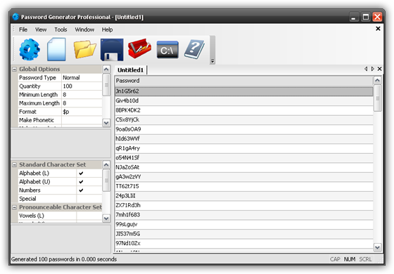 Password Generator Professional - программа, которая способна быстро генерировать до 10 миллионов уникальных паролей, ников и логинов за один сеанс. Экспорт списка паролей осуществляется в форматах txt, csv, html или mdb. Программа очень полезна пользователям, которые часто вынуждены менять аккаунты и различные пароли, которым есть чего терять заботясь о безопасности и своей репутации.