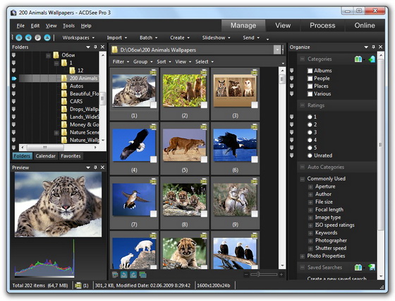 ACDSee Pro - профессиональная программа для работы с цифровыми фотографиями, которая обладает расширенным набором функций, рассчитанных на профессиональных фотографов. Поддерживает более 100 форматов графических файлов, позволяет работать с RAW-изображениями, автоматически сортировать фотографии по параметрам, полученным из цифровых фотокамер, содержит эффективный визуальный метод добавления к изображениям метатегов и быструю пакетную обработку большого количества картинок, в том числе и в RAW формате. Кроме того, здесь присутствуют инструменты для независимого регулирования цветовых каналов, исправления артефактов фотографий, появляющихся из-за погрешностей оптики, добавления "водяных знаков", работы с IPTC-метаданными, имеется возможность архивирования графических коллекций в ZIP-файлы, запись на CD или DVD и многое другое.