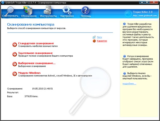 Trojan Killer - программа для обнаружения и удаления вредоносных шпионских модулей, таких как программы шпионы (spyware), рекламные баннеры (adware), вредоносные программы (malware), перехватчики клавиатуры (keyloggers), дайлеры (dialer) и другие. Защитит ваш компьютер от кражи данных и установки мошеннических программ.