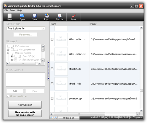 Vistanita Duplicate Finder - программа для поиска и удаления одинаковых файлов на вашем ПК. Vistanita Duplicate Finder найдет абсолютные дубликаты на диске, независимо от их названия, расширения, веса и даты, т е полные аналоги, подсветит их зеленым цветом и предложит вам принять решение о их удалении. Помимо этого программа находит похожие файлы музыки и картинок и для удобства имеет окно предварительного просмотра перед удалением. Vistanita Duplicate Finder использует метод Byte-to-Byte, который, как заявляют разработчики, находит дубликаты файлов в 100% случаях. Программа использует минимум ресурсов и может работать даже на старых ПК. Совместима с Windows Vista.