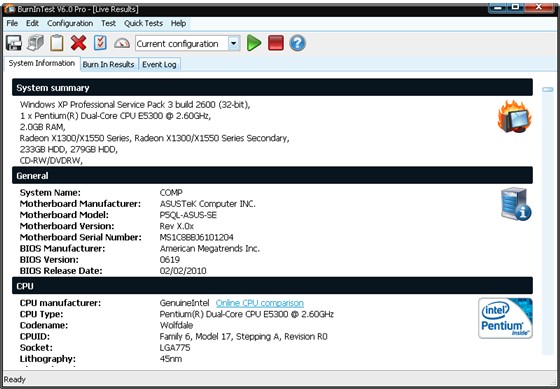 BurnInTest Professional - профессиональная версия программы для всестороннего и детального тестирования компонентов компьютера. Утилита тестирует скорость процессора, оперативную память, жесткие диски, CD/DVD приводы, звуковые карты, видеокарты, принтеры, сетевые соединения. BurnInTest Professional также может проводить тестирование последовательных (до 12 портов одновременно) и параллельных портов, портов USB (до 10 портов одновременно). Также в профессиональной версии имеются дополнительные параметры тестирования процессоров и видеокарт. После тестирования программа выдает отчет с найденными ошибками и нестабильностями. Идеально подходит для любителей разгона.
