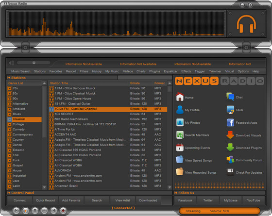 Nexus Radio – не просто плеер онлайн-радио, помимо целого ряда функций и стильного графического интерфейса, программа поддерживает 11,000+ интернет-станций. С помощью Nexus Radio можно не только слушать музыку любого стиля, но и записывать дорожки из эфира в MP3 формат. Никаких трудностей данная операция не вызовет. Трек записывается не только при нажатии на кнопку Record, но и в указанный период времени и даже день.