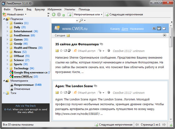 самая лучшая прога Только ей и пользуюсь Ррс каналов уже 20 штук и 90% новостей не читаю из-за их огромного кол-ва Даже сайты почти не посещаю Смысл отпал)))))))))))))) И так все знаю