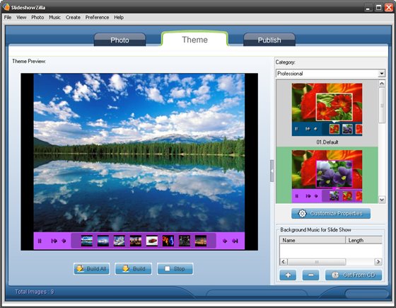 SlideshowZilla - программа для создания собственного фотоальбома или слайд-шоу со своими фотографиями. Готовые слайдшоу можно разместить в интернете на сайте. Программа имеет красивый графический интерфейс ввиде flash, имеет поддержку шаблонов. Для создания собственных клипов есть готовые шаблоны, надо просто выбрать подходящий и изменить настройки по своему желанию.