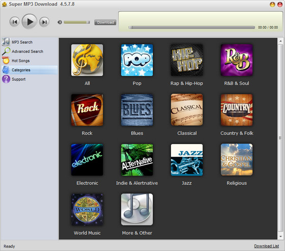 Super MP3 Download - прямой доступ к бесплатной музыке. Этот mp3 загрузчик надолго обеспечит Вас музыкальными композициями. В мире существуют тысячи групп и исполнителей, предлагающих свое творчество бесплатно. Шанс найти среди них что-нибудь по душе очень велик. Чтобы облегчить Ваш поиск, программа предложит топ сто недели и лучшее в четырнадцати жанрах. Вы сможете сначала прослушать мелодию и лишь потом сохранить её на жесткий диск.