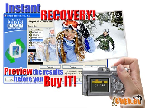 Digital PhotoRescue Professional - программа для восстановления удалённых фотографий с самых разнообразных носителей информации: цифровых фотоаппаратов, жестких дисков, CD/DVD дисков, мобильных телефонов, а также всех известных флэш-карт таких как CompactFlash (type I/II), IBM Microdrives, SmartMedia, MultiMedia (MMCs), Secure Digital (SD), SONY Memory Stick и другие).