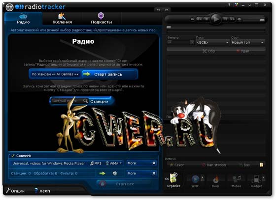 RadioTracker - программа, использующая около 15.000 интернет-радио станций для прослушивания и записи музыки в формате mp3. Возможности программы довольно велики: поиск нужной музыки, разбивка на разные жанры (Dance/House, Pop, Rap, Rock, Techno, Metal, Jazz, 80s, 70s и т.д.), при сохранение треков сохраняется и вся информация об исполнителе и прочая нужная информация, возможность использования фильтров для очистки от рекламы и прочих шумов на радио.